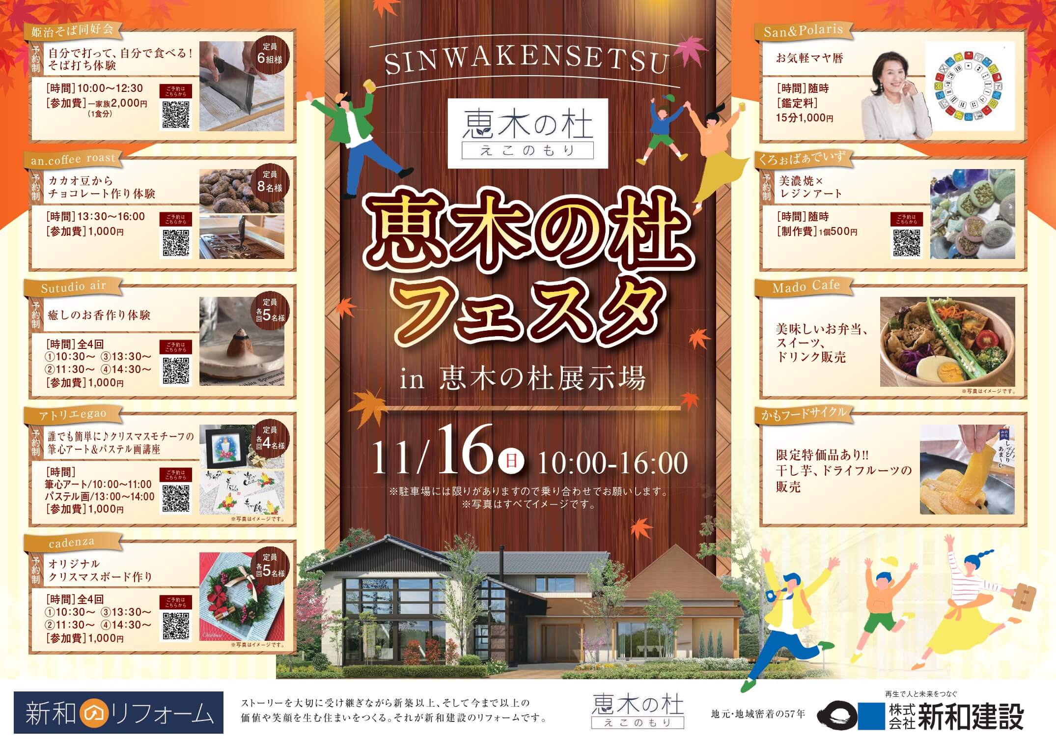 楽しいイベント盛りだくさん!リフォームを考えている方必見のセミナーや、そば打ち体験、チョコレート作りやお香作り、クリスマスに向けたアート作りや占い、美濃焼を使ったレジンアートなど様々な体験会、お弁当やスイーツ販売もあります。ぜひお越しください!