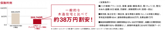 三井ホームの建物は省令準耐火建物(T構造)であるため、一般の木造住宅に比べて火災保険料が割安です。この事実はまさに耐火性能が評価されていることの証です。