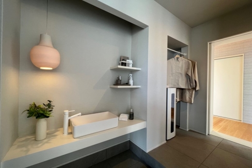 「ただいま」のあと、すぐの手洗いうがいで感染予防!着替えもできて自然に気持ちのオンオフが切り替えられる、チェンジングルーム兼手洗い付き土間収納。