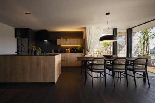 ブラックオークの床材とホワイト大判タイルのコントラストによるバイカラーインテリアのモダン空間。