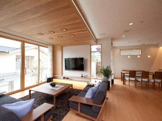 明るく、開放感のあるリビングは、4メートル幅もある大きな窓が自慢です。トヨタホームは地震に強い「パワースケルトン」構造だから、壁一面を大きな窓にすることができます。