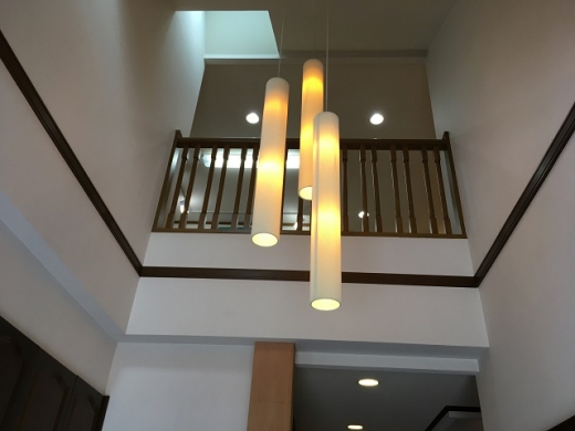 玄関を入るとこちらの景色でお出迎え。大きな吹抜けとスカイライトが、明るく開放感のある空間を作り、デザイン性の高いライトが映える玄関です。吹抜けにある手摺の繊細な加工も、格調ある雰囲気とより一層のゆとりを演出。無垢塗装で仕上げた大容量収納が可能なオリジナルシューズボックスもなんと標準仕様!住まいの顔である玄関をより一層スッキリさせてくれます。