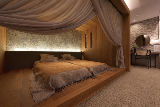 天井と床にチークをふんだんに使い、贅沢なスイートルームをイメージさせる空間に仕上げています。