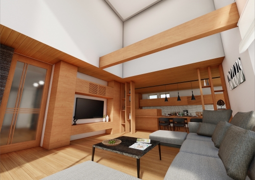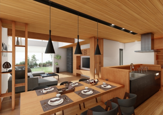 天井高が、5mを超えるダイナミックな吹き抜け空間。インテリアスタイルは、ウッディモダンを採用。大空間を感じつつ、木の素材が持つ豊かな表情が、心穏やかに生活できるリビングを演出してくれております。開放的かつ落ち着きのある空間をお楽しみ下さい。