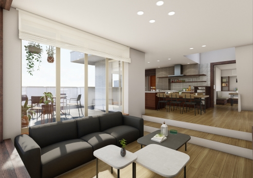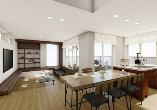 ダウンフロアのあるリビングは、床に段差をつけることにより、視線の高さが変化し、空間に動きを与えます。その効果は、リビング空間にたくさんの居心地の良さをもたらします。ベンチに座り、落ち着きを。ソファに腰掛け、広がりを。家族団欒の大切なひと時をお過ごし下さい。