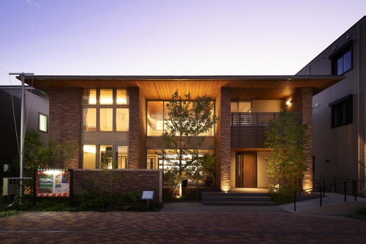 重厚感のある寄棟外観。軒の出を深くし、奥行き感を演出。外壁から室内につながる当社オリジナルタイルはオンリーワンな外観デザインを作りあげます。
