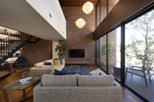 ビッグフレーム構法だからこそできた大迫力の吹き抜け空間と大開口サッシは 圧巻です。木造住宅とは思えない大きな空間と、内外に渡るタイルや木調天井材のデザイン力にもご注目ください。