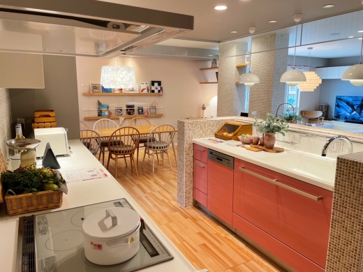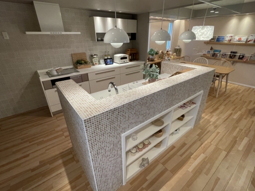 天然木の家具と、モザイクの細かなタイルが空間に癒しと豊かさをもたらします。コミュニケーションを大切と考えた空間です。IoTを駆使した設備は、奥様の家事の効率化をサポートし、時間のゆとりを生み出します。