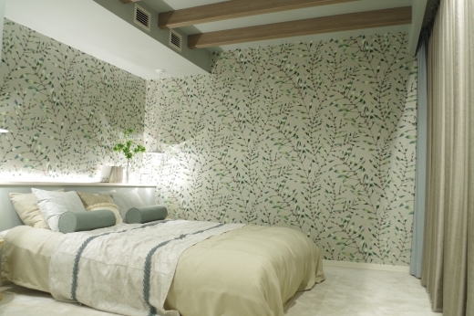 コンパクトな空間ながらも、床のカーペット、ベットヘッドのアクセントクロス、天井梁、空間を広く、優しく見せる仕掛けを織り込みました。