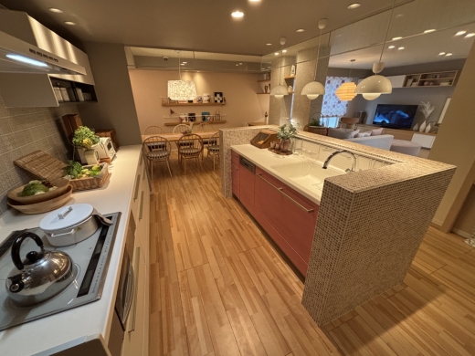 天然木の家具と、モザイクの細かなタイルが空間に癒しと豊かさをもたらします。コミュニケーションを大切と考えた空間です。ピンク
