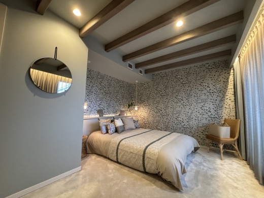 コンパクトな空間ながらも、床のカーペット、ベットヘッドのアクセントクロス、天井梁、空間を広く、優しく見せる仕掛けを織り込みました。