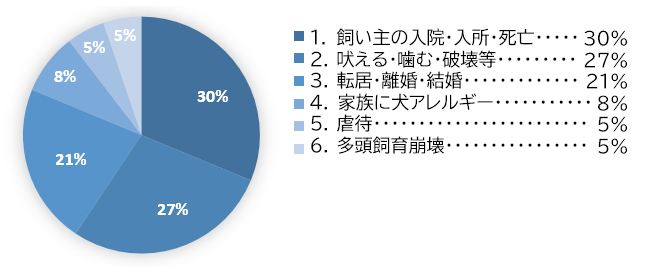えっ!と驚くような理由も多々発生しているのです。各都道府県の環境や状況により違いがありますが、名古屋市には野犬と言われる犬はほとんどいないのです。名古屋市にあるドッグデュッカで保護案件の内訳は、飼い主の入院・入所・死亡が30%、吠える・噛む・破壊等が27%、転居・離婚・結婚が21%、家族に犬アレルギーが8%、虐待が5%、多頭飼育崩壊が5%です。