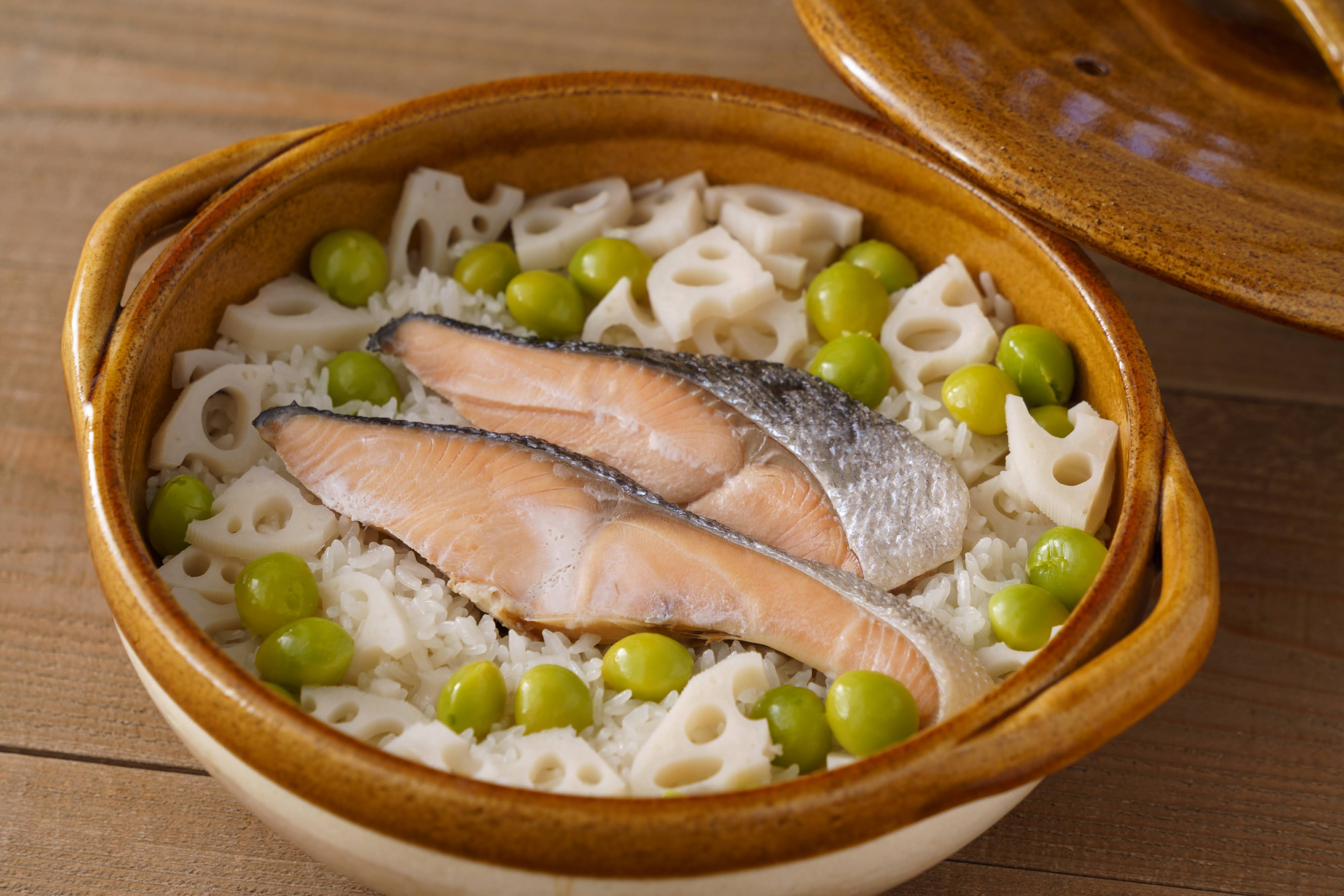 ④②をザルにあげ、水けをきって土鍋に入れる。水、酒、みりん、薄口しょうゆ、昆布、鮭、③、①を入れて炊く。※炊飯器でも可。