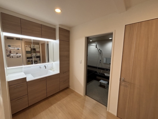 一条のオリジナル洗面化粧台「ラシックドレッサー」は優しい印象を与える木目調仕上げで、キッチンとのカラーコーディネートも楽しめ、デザイン性も優れています。それだけでなく、「オリジナル多機能三面鏡」の中はすべて収納スペースになっており、ドレッサー収納に加えて、大量の洗面用具やリネン材をすっきりと機能的におさめることができます。キャビネットは「耐震ロック」を搭載するなど、こだわりの機能も満載です。