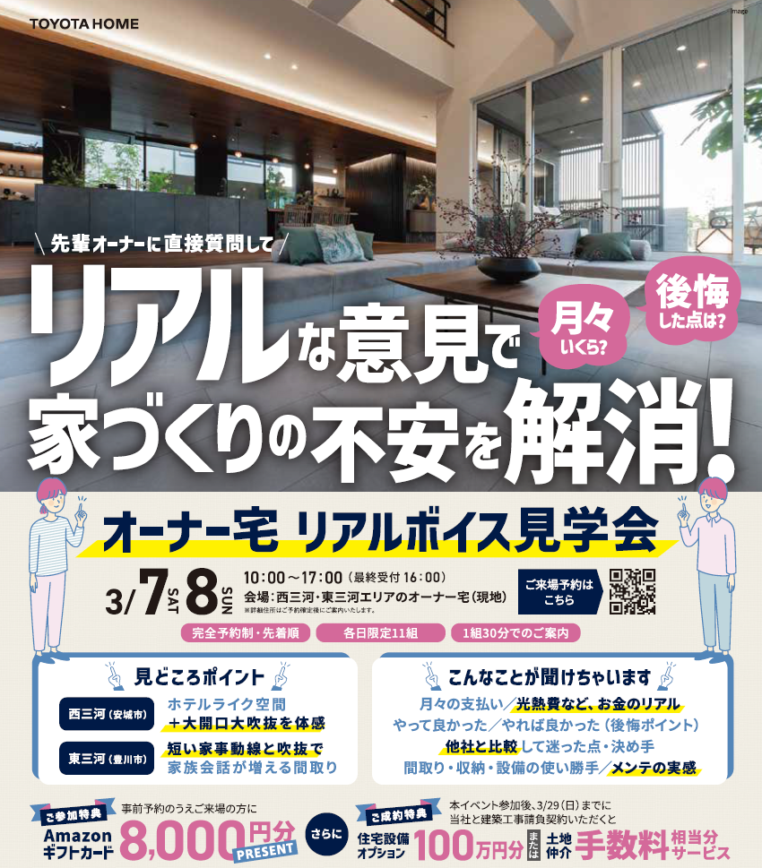 - 🌸来場予約でアマギフ20,000円分🌸3/7,8オーナー宅見学会!